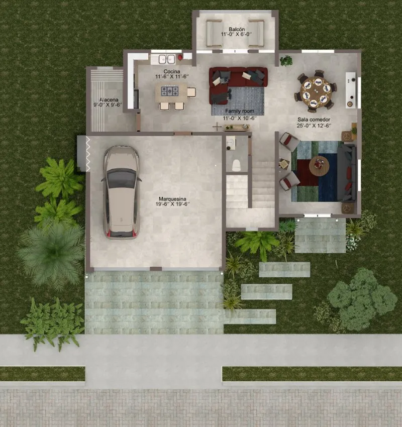 En la planta baja se encuentran, excelentemente distribuidas, las áreas comunes para la reunión placentera con familiares y visitantes. La cocina tiene la ubicación perfecta para un acceso adecuado, y el salón familiar tiene salida al exterior para el disfrute de un hermoso balcón que invita a la relajación. Esta planta también cuenta con una amplia alacena que brinda un espacio adicional para organizar las pertenencias. Además tiene una marquesina doble para estacionar sus vehículos y un closet para guardar diferentes artículos.