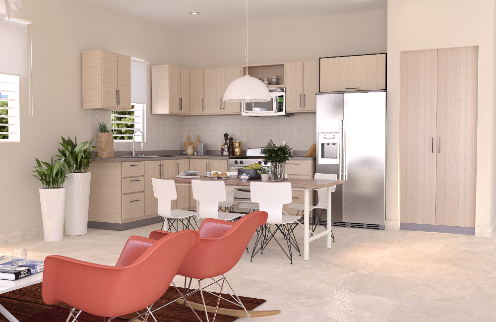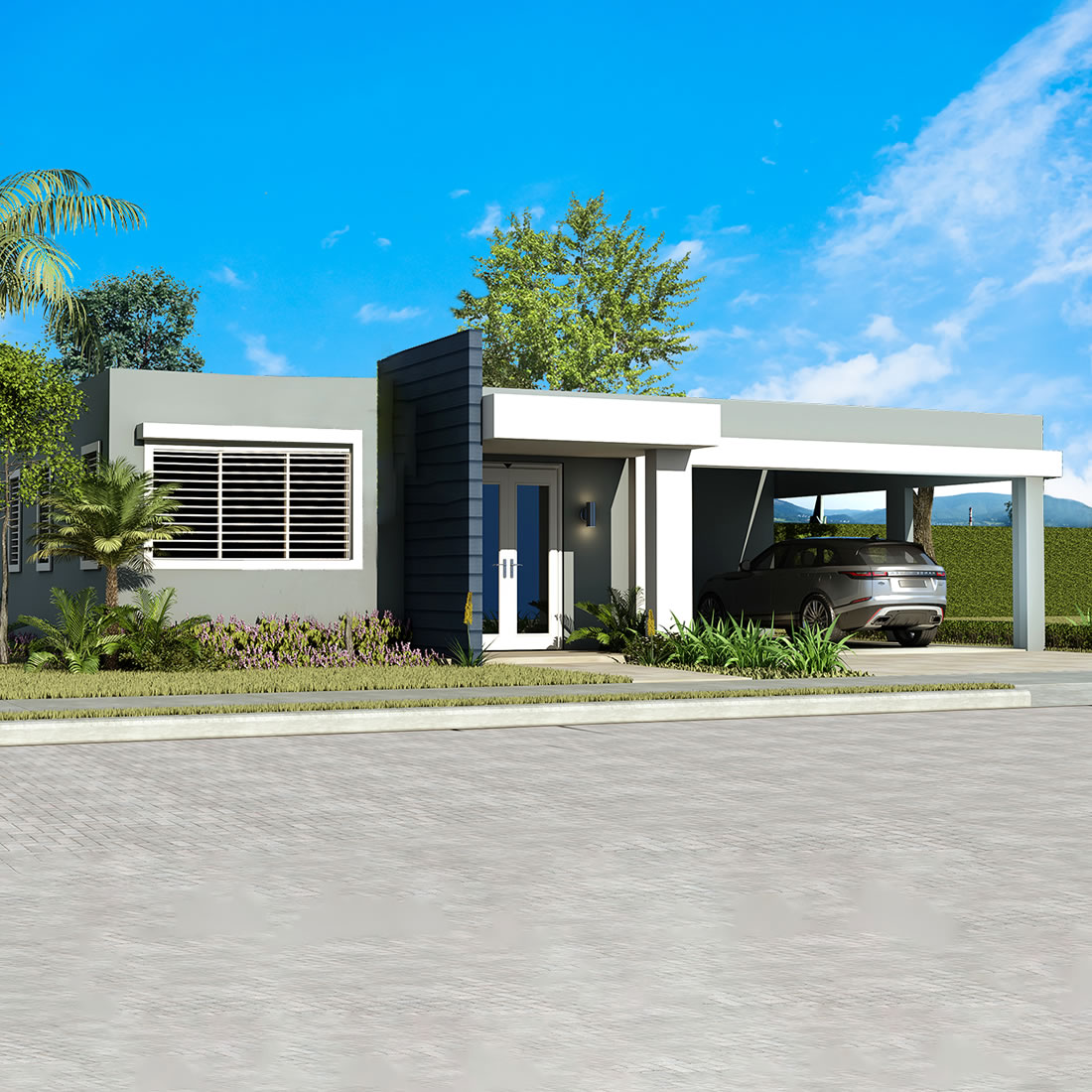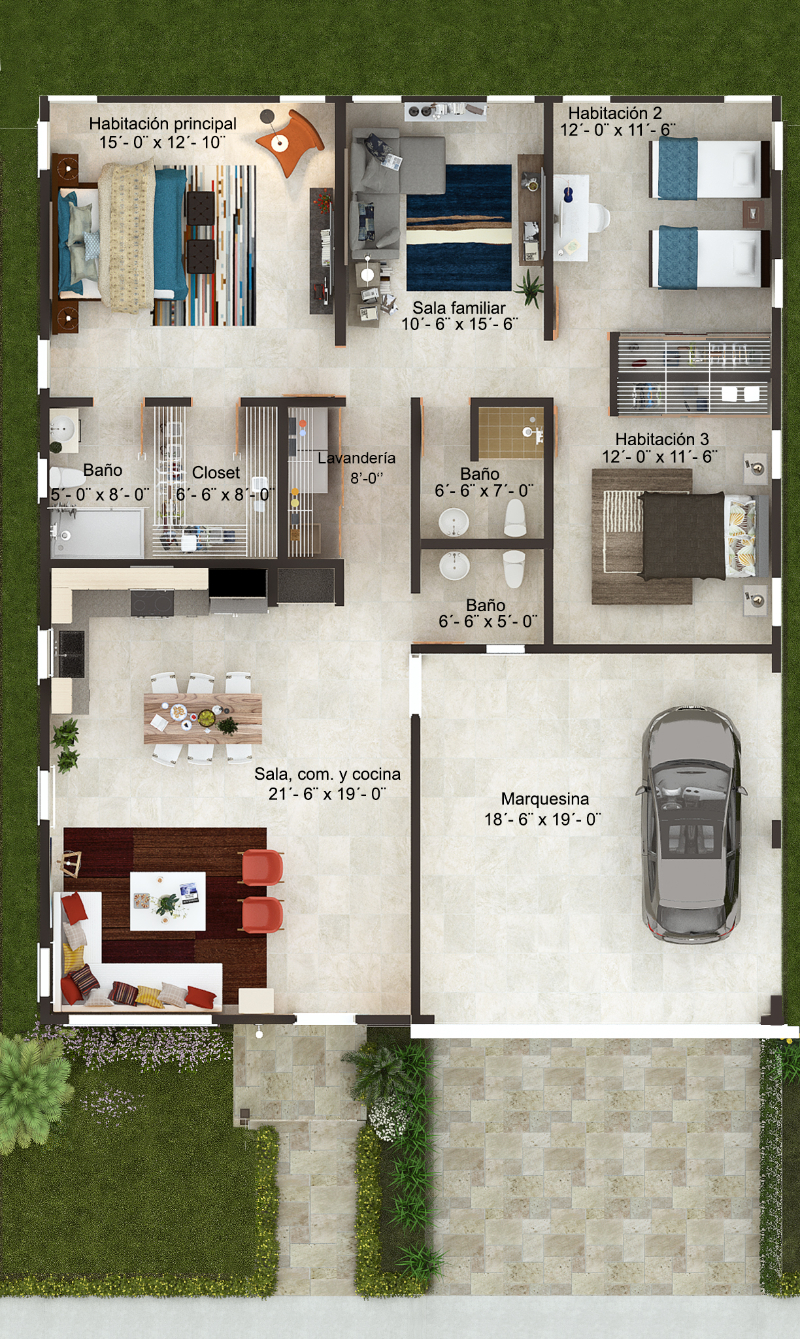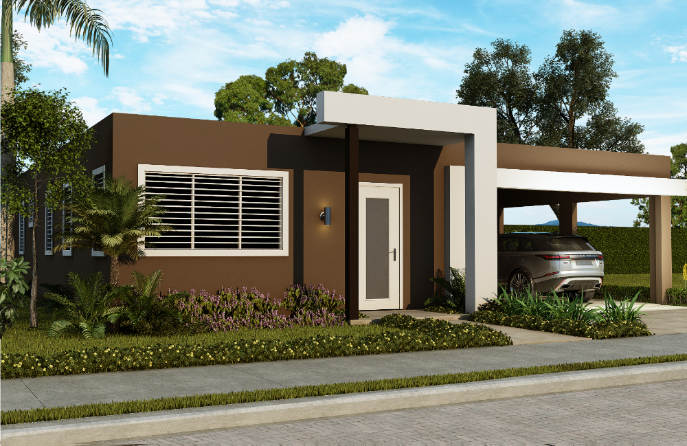 Por otro lado, su sala, comedor y cocina, han sido diseñados bajo un concepto de espacio abierto otorgando amplitud y confort. La amplia marquesina doble del Modelo Suiza, es un excelente espacio para disfrutar en los días de celebración.